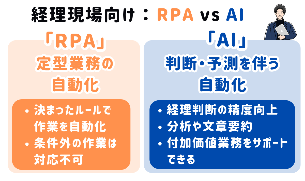 経理では、「RPAでルール作業を効率化」し、「AIで判断業務をサポート」する組み合わせが最も効果的です。