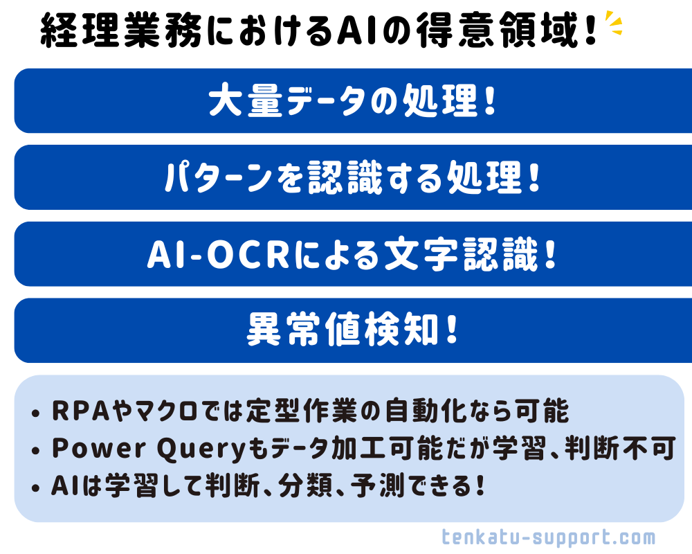 文脈や状況で判断が変わる業務や例外的な取引への対応、状況に応じて柔軟に対応する必要がある業務は不得意。
