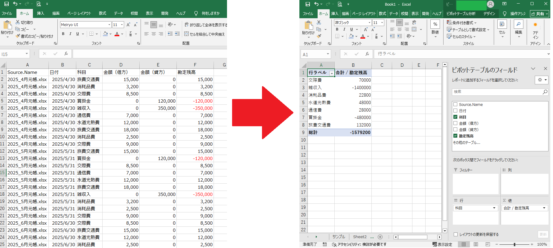 特に売上データや仕訳明細のように「量が多くて切り口を変えて見たい」データは、ピボットなしでは正直やってられません。