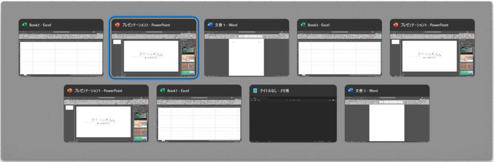 エクセルに限ったショートカットではありませんが、マウスを触らず視覚的に作業したいアプリを表示できるのでとても便利です。