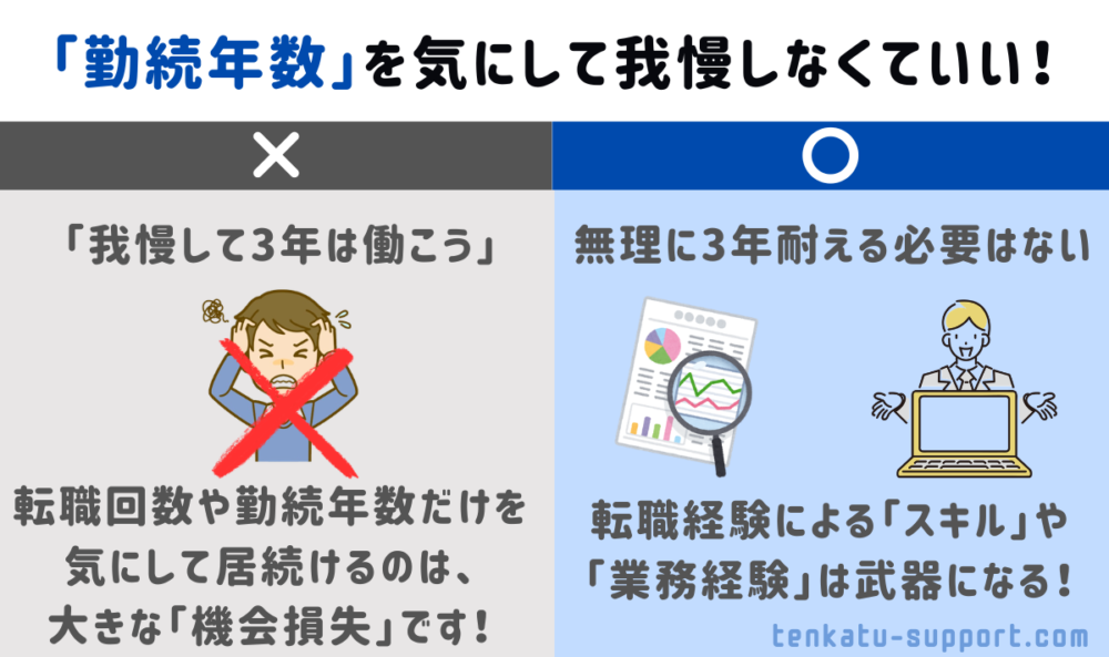 勤続年数の大事さを説明しましたが、転職への影響だけを気にして、ブラックな職場に我慢して3年以上勤務する必要はありません。