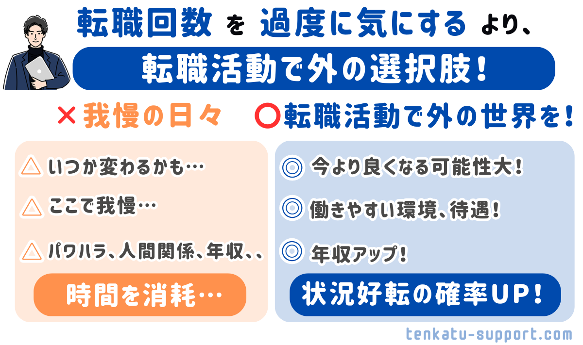 転職回数だけを気にして、今の会社で我慢するのはやめましょう。それよりも、働きながら転職活動を進めてみて、今より自分に合った職場から内定をもらって未来の勝ちを確信できたら転職するという方法をおすすめします。
